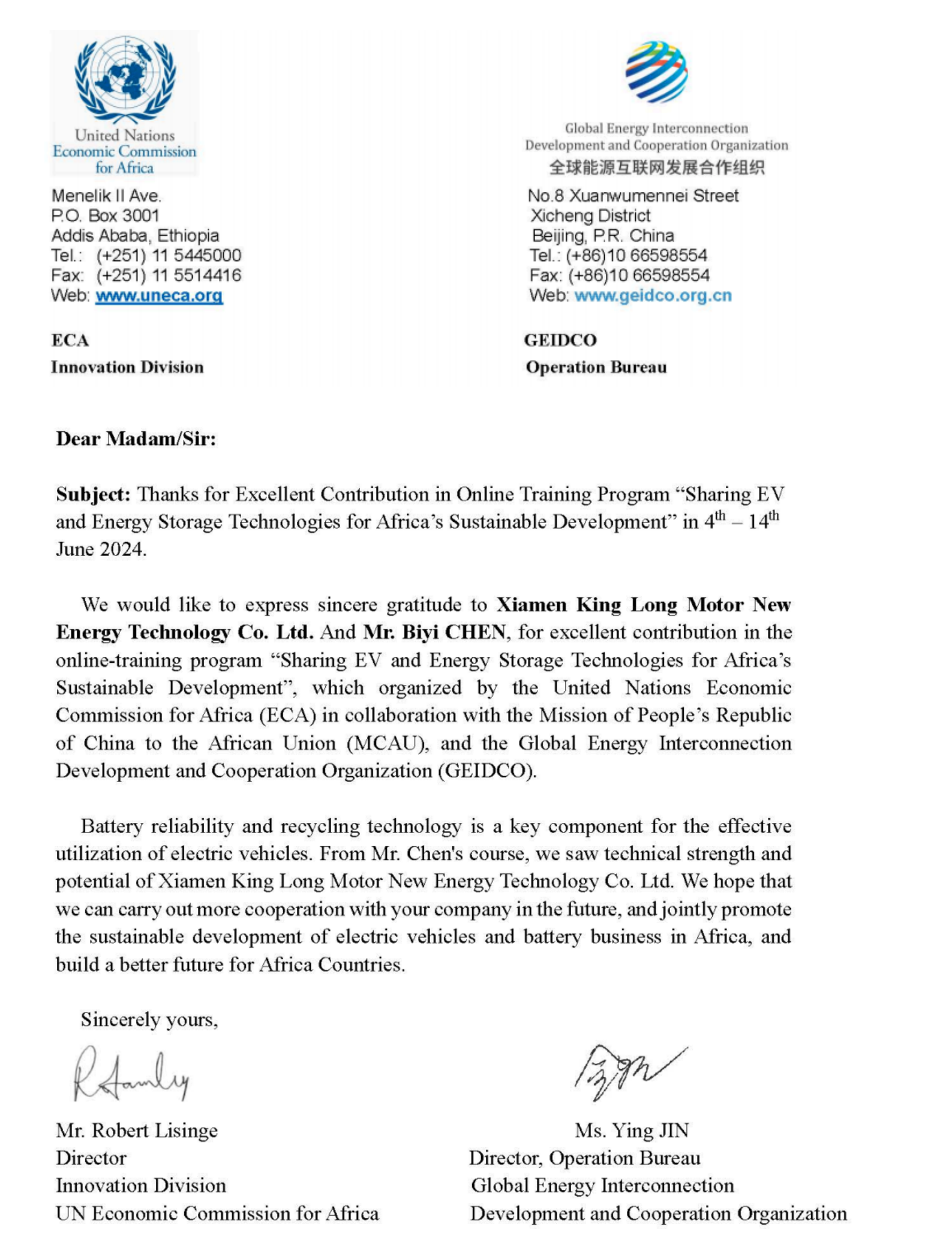 会后组织方及学员纷纷发来感谢信。其中,全球能源互联网发展合作组织在信中提到:“我们看到了厦门z6尊龙官网登录入口汽车新能源科技有限公司的技术实力和潜力。我们希望未来能与贵公司开展更多合作,共同促进非洲电动汽车和电池业务的可持续发展,为非洲国家建设更美好的未来。